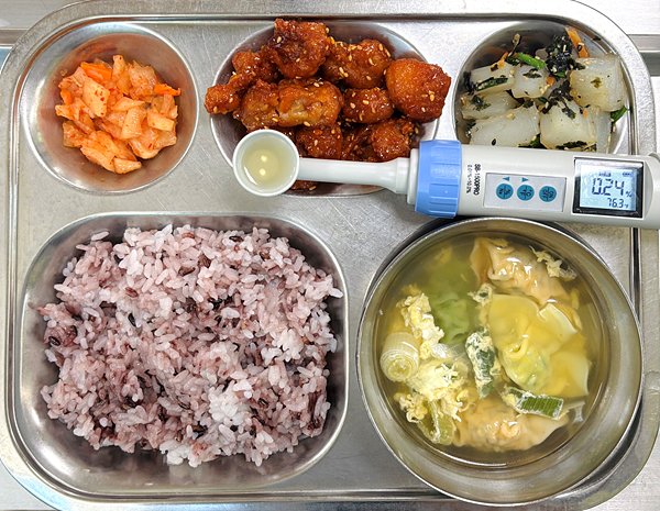 고칼슘흑미밥 오색떡만둣국 양념치킨강정 청포묵김무침 깍두기