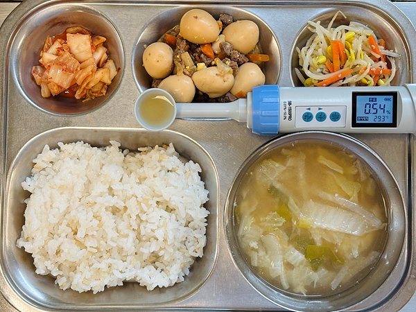 고칼슘현미밥 콩가루배춧국 소고기메추리알장조림/소고기두부조림 콩나물무침 깍두기
