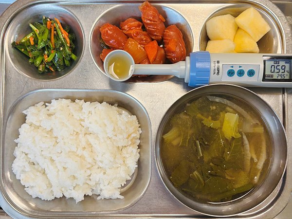 고칼슘찹쌀밥 얼갈이배춧국 소세지야채볶음 부추김치 사과/배