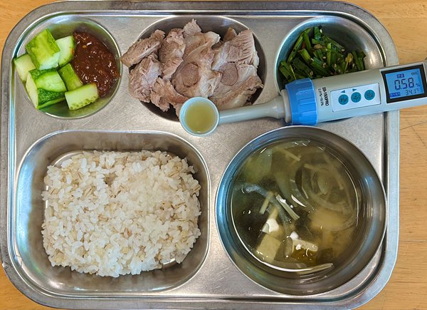 고칼슘보리밥 미소두부된장국 돼지고기수육 오이스틱/쌈장 부추김치