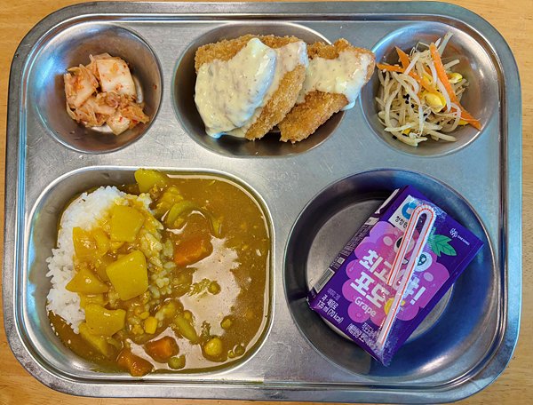 옥수수카레밥 생선까스/타르소스 콩나물무침 배추김치 포도주스