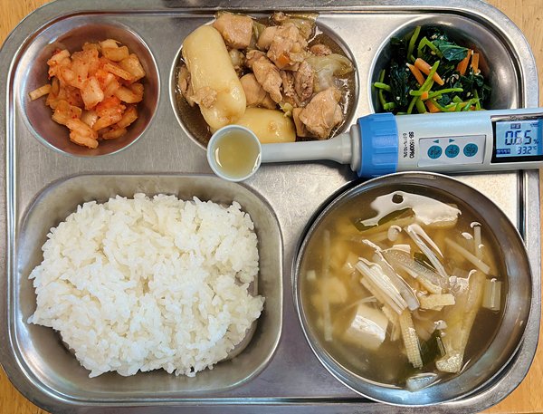 고칼슘찹쌀밥 팽이유부장국 치즈떡닭갈비 참나물무침 깍두기 매실에이드