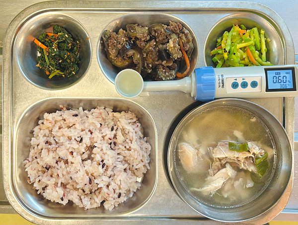 고칼슘흑미밥 닭곰탕 소고기가지볶음 애호박나물무침 깻잎김치