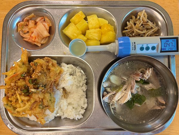 고칼슘찹쌀밥 순살삼계탕 지님채간장조림 수제모둠채소튀김 배추김치 파인애플